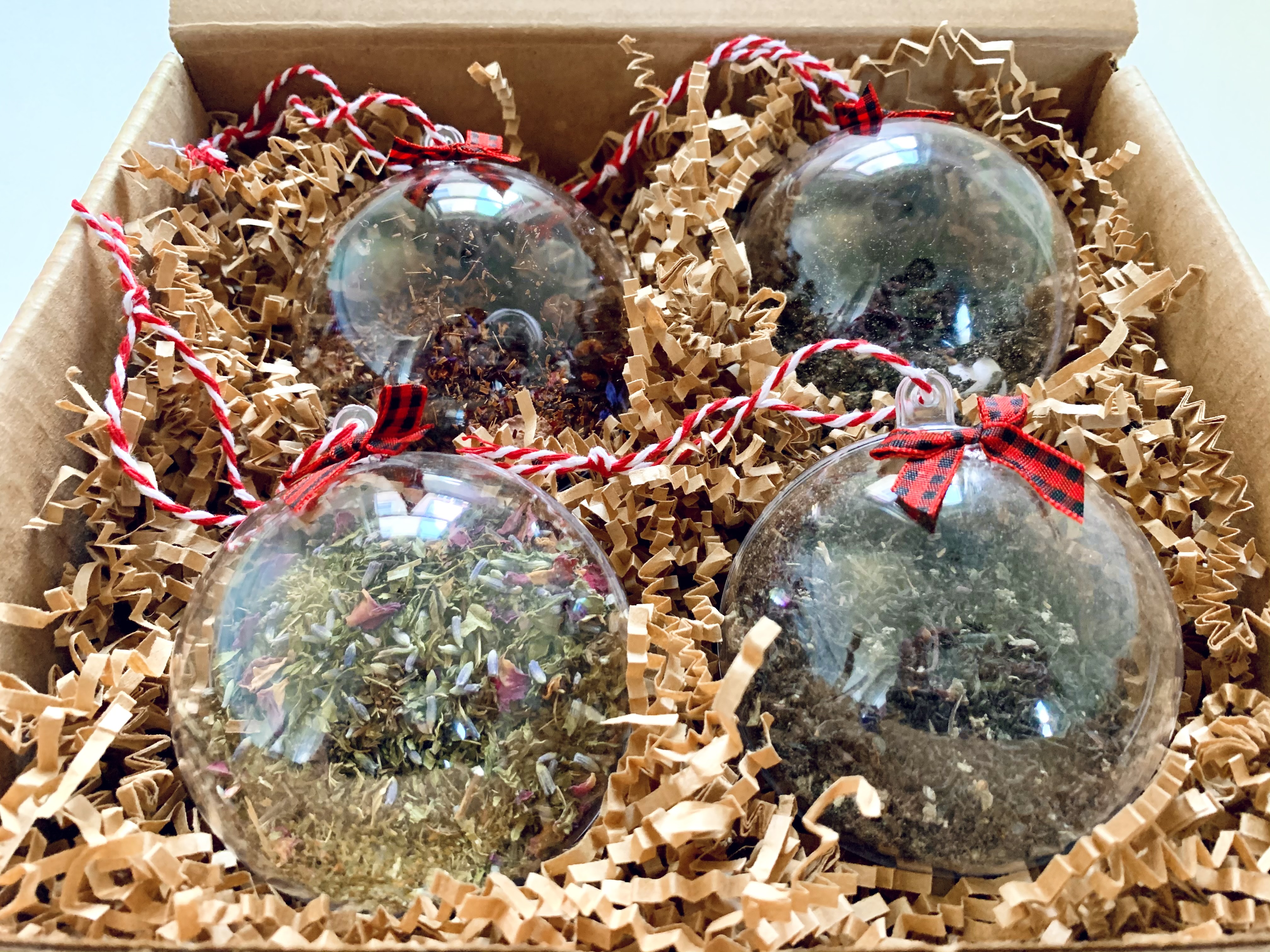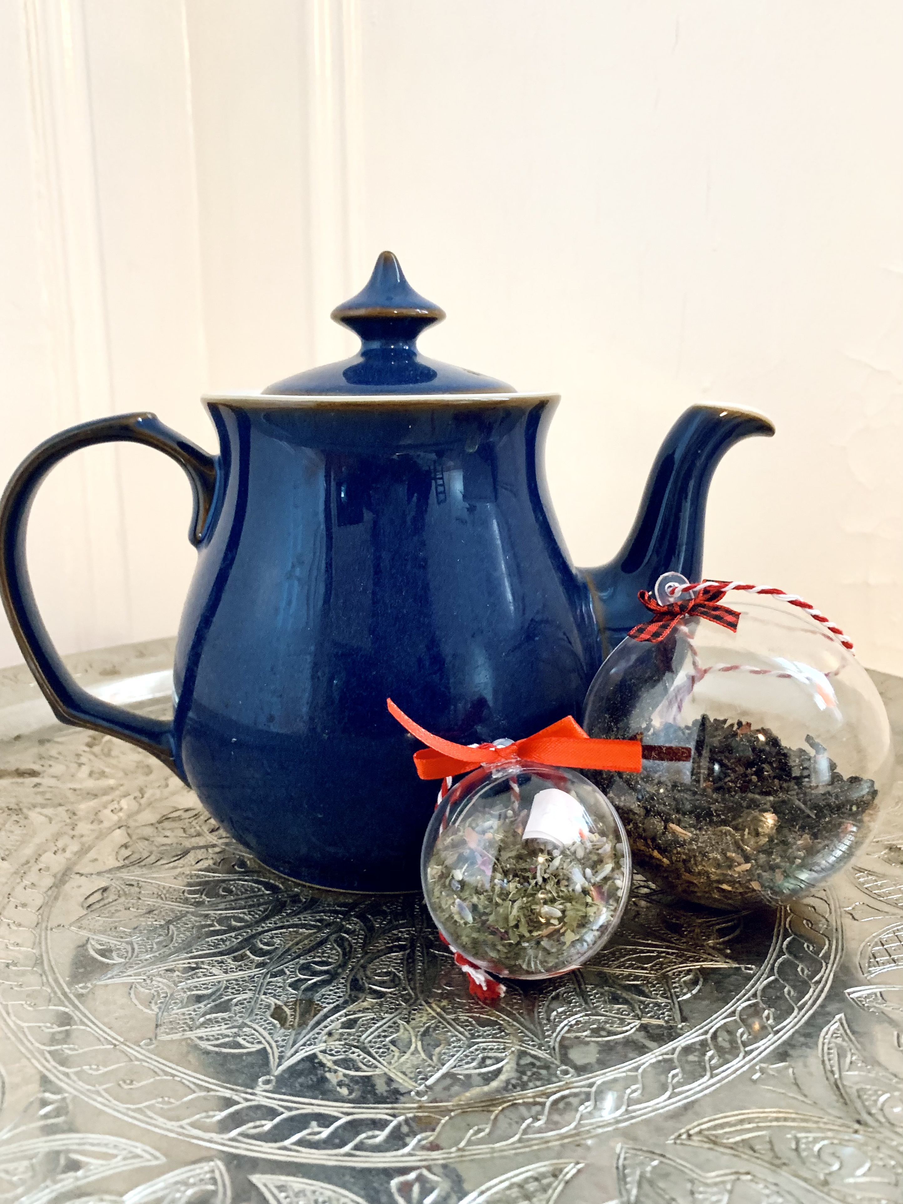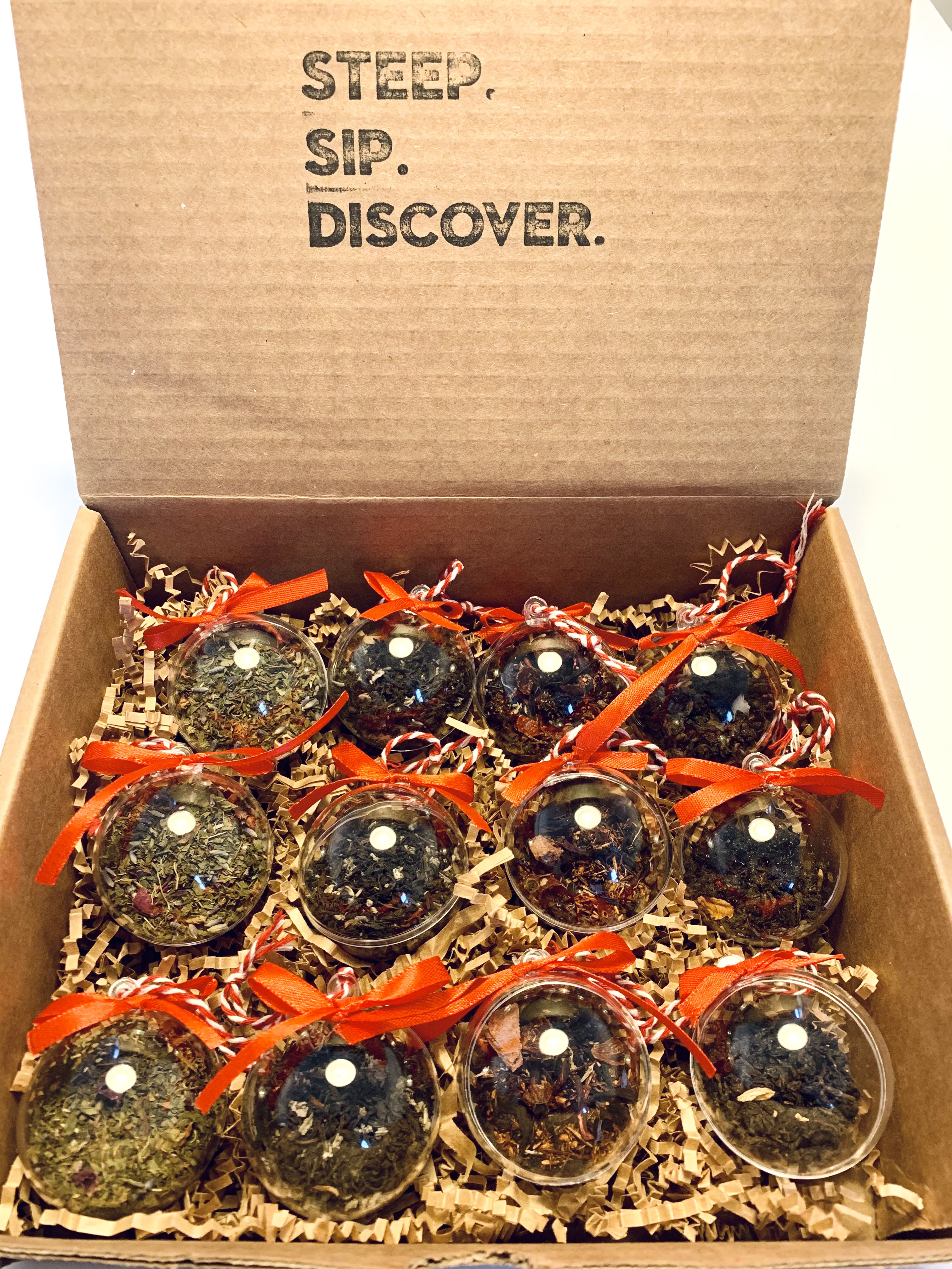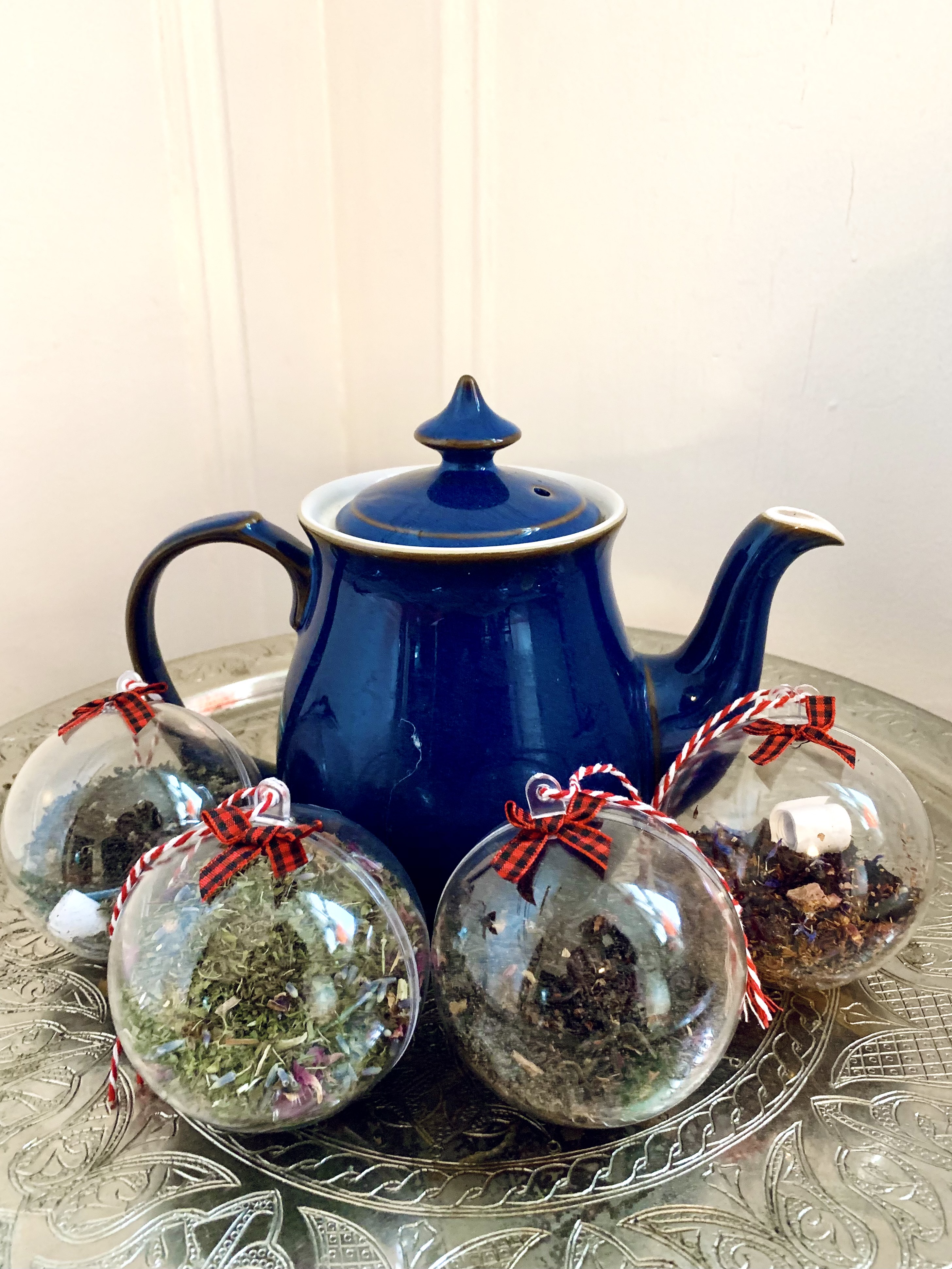 The perfect way to decorate your tree. Hang and enjoy, then open and sip! 4 Large Baubles (40 total servings) or 12 Mini Baubles (24 total servings). Baubles contain 4 of our Teton Tea blends: - Gros Ventre Green: Elderflower + Tulsi + Jasmine Green Tea - Sleeping Indian: Spearmint + Lavender + Rose - Antelope Flats: Sage + Assam Black Tea - EqualiTEA: Raspberry + Rose + Earl Grey Black Tea All baubles contain blend info and brewing instructions inside.